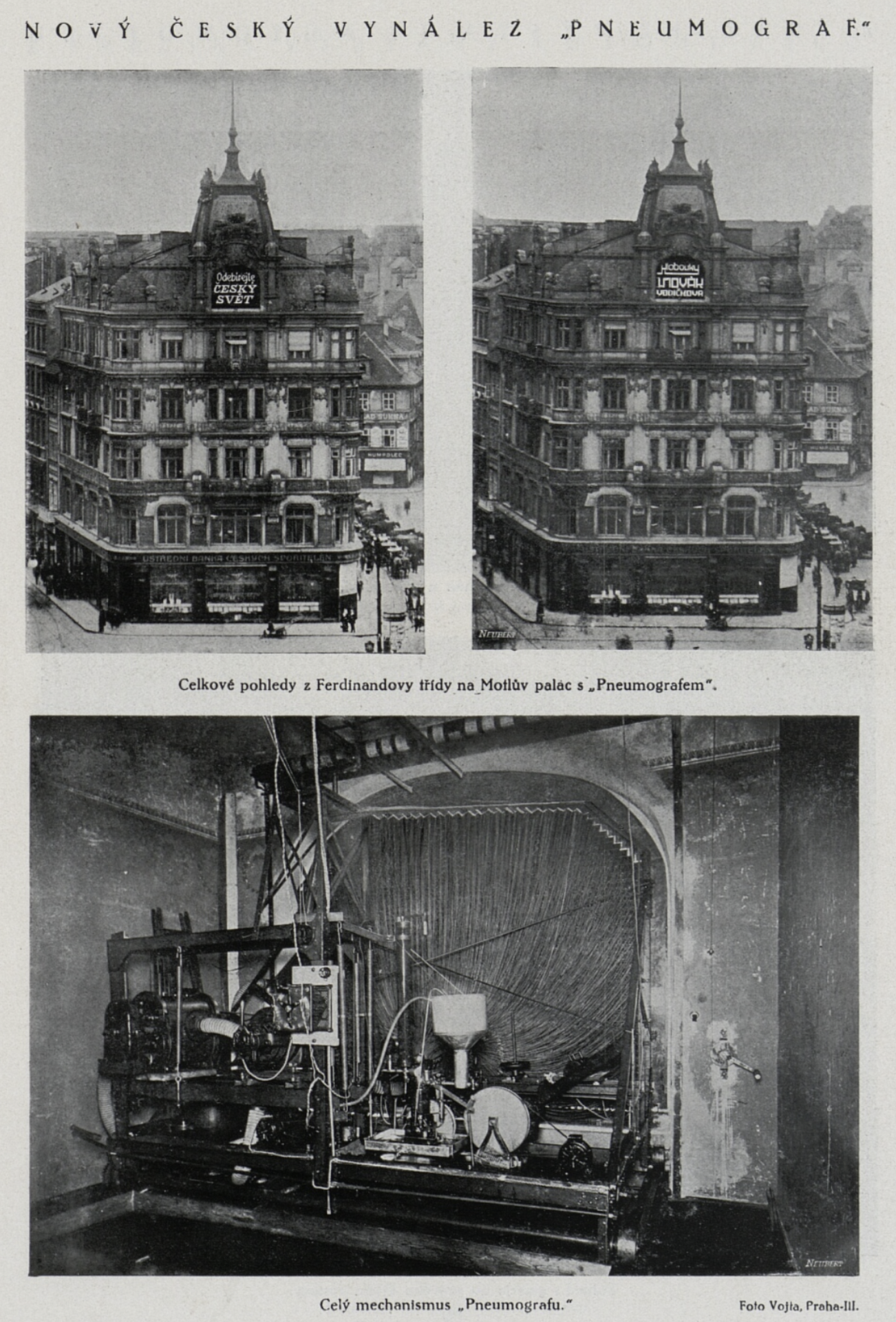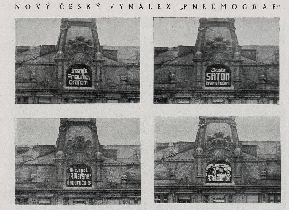 Vynalezl také pneumograf - tabuli, na které bylo možné tvořit různé, převážně reklamní nápisy. Na snímku vpravo níže lze spatřit toto zařízení i z druhé strany, šlo o velice důmyslný stroj.